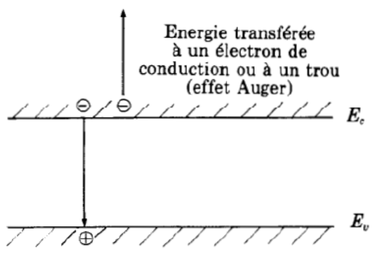 Un autre processus est également possible (recombinaison Auger) : un électron retombe dans la bande de valence, l'énergie correspondante étant cédée à un autre électron de conduction qui monte en énergie dans la bande.